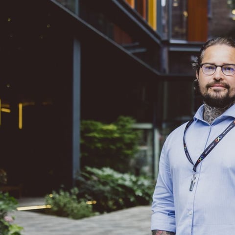 A man is smiling and looking directly at the camera, with his hands tucked into his jean pockets. He is wearing a pale blue shirt, and a lanyard signalling neurodiversity. He has glasses and you can see tattoos at the top of his shirt and on his arms, and two piercings on his chin. He is standing in front of a pale brick wall.